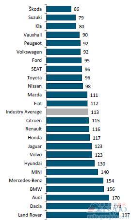 J.D. Power调查结果显示,斯柯达每一百辆车会出现62个故障,可靠性最强;接着是每百辆车79个故障的铃木,以及每百辆车80个故障的起亚。此外,豪车品牌出现的故障却最多,路虎故障最多,每百辆车故障达到197个,超过行业113的平均数值。豪华车奥迪故障打170个,宝马156,奔驰154,是故障最多的四个品牌。