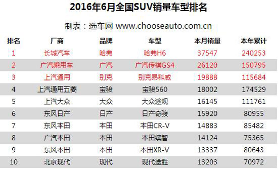 上半年前十车型,分别是哈弗H6、宝骏560、传祺GS4、别克昂科威、途观、瑞风S3、长安CS75、长安CS35、本田CR-V、日产奇骏。其中,自主占据六席。