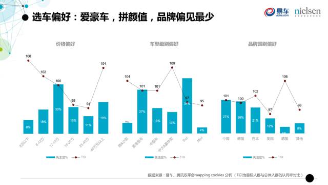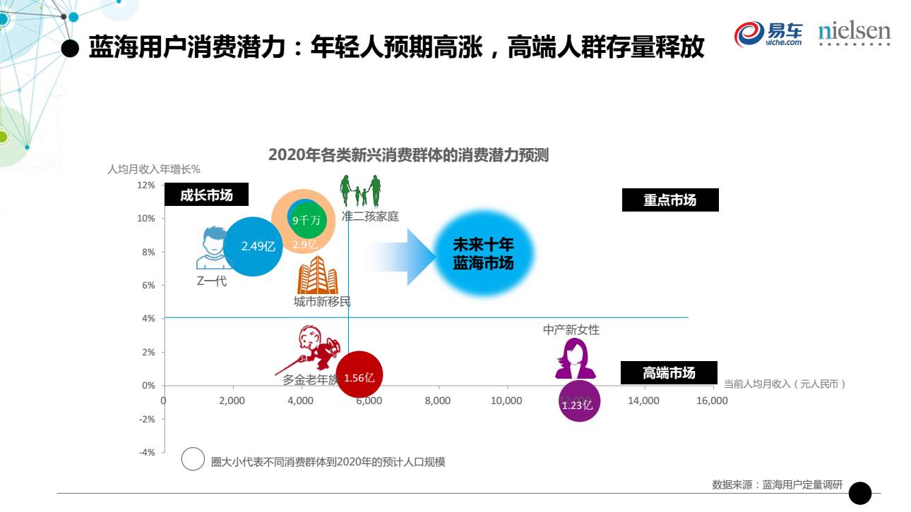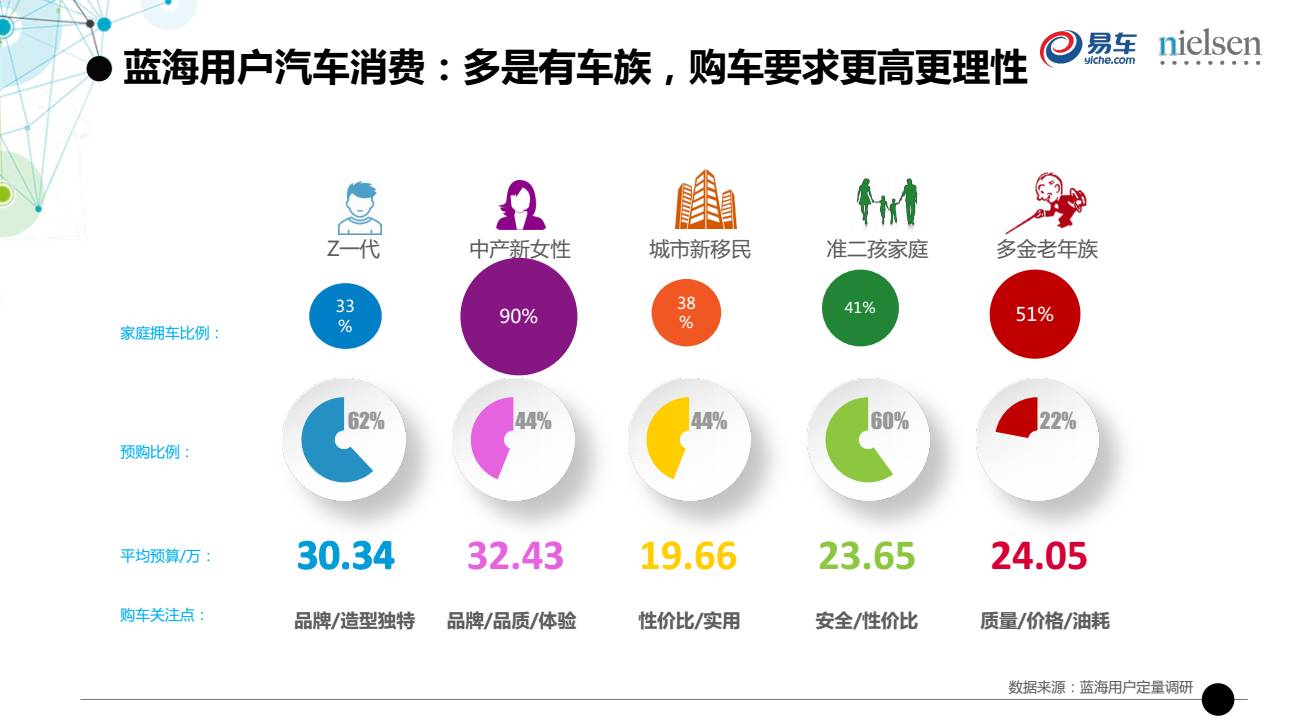 易车联合腾讯、尼尔森,以海量大数据计算为基础,从人口属性、车型访问偏好、汽车消费观等方面对五个蓝海用户群体进行了用户画像描述。