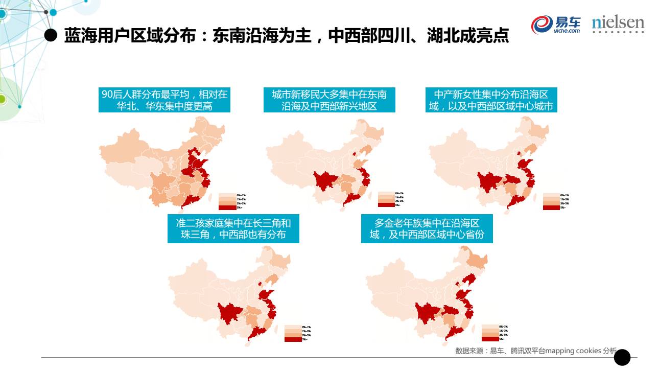五个蓝海用户群体普遍分布在经济发达的环渤海、长三角、珠三角等东南部沿海区域,而中西部省份中,四川、湖南、重庆均分布了多个蓝海用户群体,与成都、武汉作为区域中心城市的地位有关。