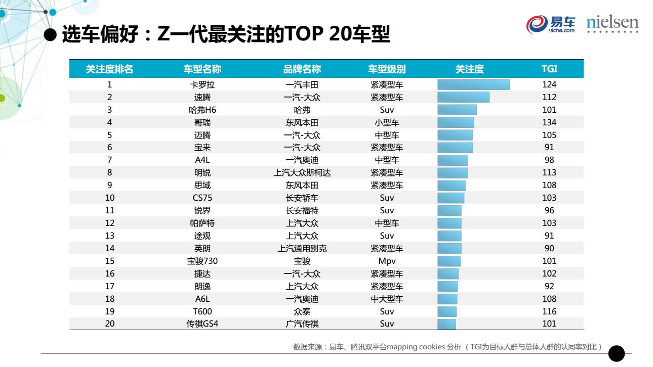 Z一代最关注的TOP20车型以合资紧凑型、中型车为主,其次是自主和合资SUV,自主轿车并未为受到Z一代的青睐。
