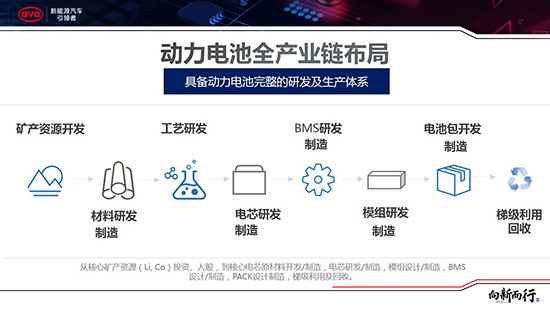 比亚迪的动力电池具有完整的全产业链,包括从原材料采集到电芯的设计、模组跟PACK的研发和制造、BMS的制造以及后期电池的梯次利用与回收。