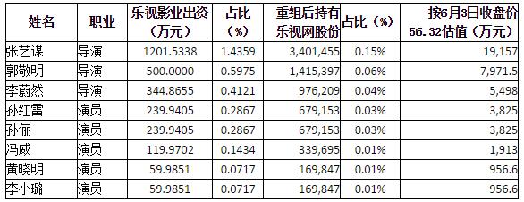 另一类是乐视影业为增强核心竞争力及长期盈利能力,通过资本合作的方式引入的知名制片人、导演,包括张艺谋、郭敬明、李力、李蔚然、高晓松(通过乐安影云间接持股)。