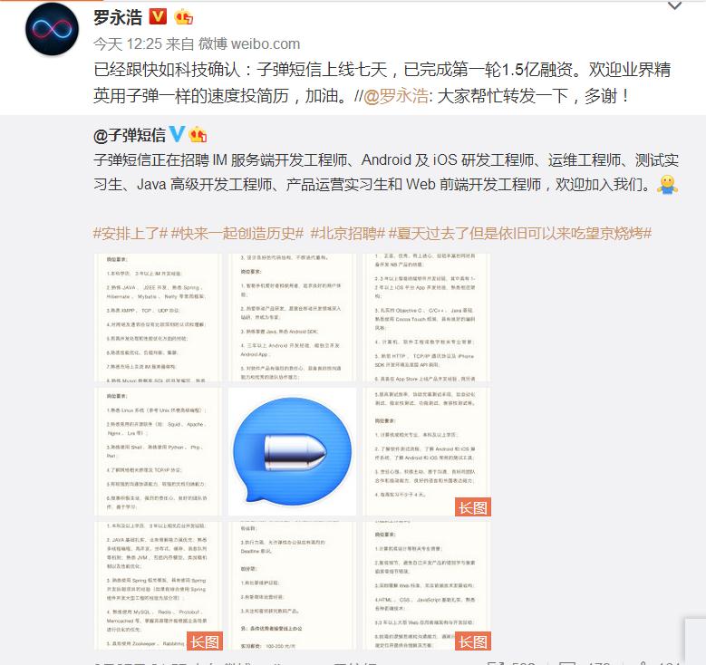 罗永浩此前刚刚在其微博称子弹短信上线七天,快如科技已经完成第一轮1.5亿融资。罗永浩还在微博透露,除了现有的手机版和网页版,子弹短信的iPad版和PC版也已经在研发之中。iPad优化的版本由于屏幕尺寸更大能显示的信息更多,在生产力提高方面将会有非常大的帮助。