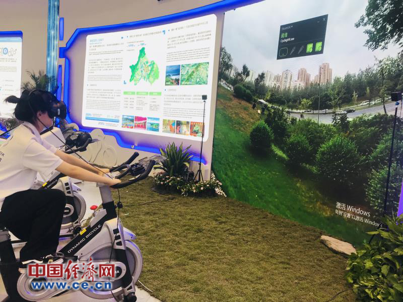 图为带上VR设备,骑上动感单车, “实地”感受天府绿道美景。经济日报-中国经济网记者王婉莹/摄