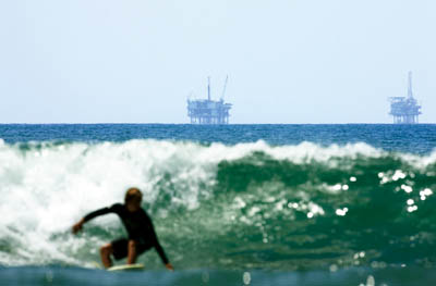 40 年前,联合石油公司(Union Oil, Unocal 的前身)位于圣巴巴拉的一座海上油井发生井喷,导致 300 多万加仑石油泄入太平洋。大片漂浮的油污蔓延了 800 平方英里的海域,最终催生了美国 1982 年的海上钻井禁令。在禁令下达之前,美国联邦水域已经有 22 座钻井平台,如今这些分布在加利福尼亚沿海的平台每天依然出产 70,000 桶石油(上图中的两个平台分别由 Dos Cuadras Offshore Resources 公司和 Pacific Operators Offshore 公司经营)。随布什总统向国会施加越来越大的压力要求其撤销禁令,分布于冲浪者天堂的新钻井平台的数量有可能会急剧上升。─Scott Cendrowski