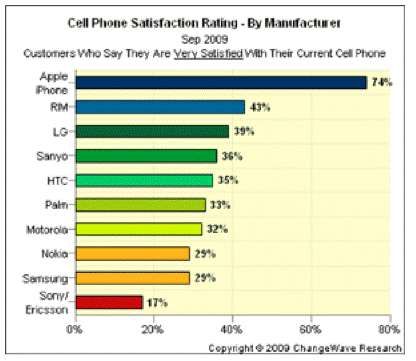 苹果仍然在消费者满意度方面领先,74%的iPhone用户称自己“非常满意”。