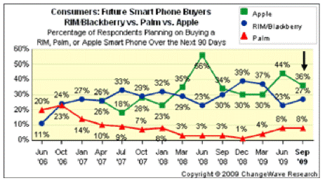 在最近的ChangeWave调查中,苹果出现增长,RIM有所浮动,Palm保持稳定。