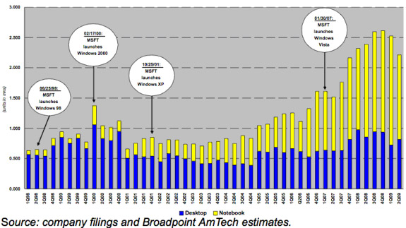 这幅图出自Broadpoint AmTech分析师布莱恩•马歇尔(Brian Marshall)于本周一发布的致客户报告。预计到Windows 7于下周(10月22日)推出,马歇尔回顾了过去10年的Mac销售数字,以分析之前4次Windows新品发布的影响: