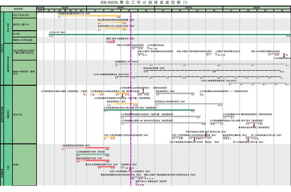北京奥组委以项目时间进度为管理中心线,建立了系统的监控机制。随着筹办工作不断深入,各类项目纷纷启动,北京奥组委的组织结构逐渐从以职能部门为主(function-based)向以场馆为主(venue-based)转变;同时,奥运筹办工作也从计划阶段进入到场馆运行阶段。从成立以来,总体策划部成功的编制了主运行计划、总体战略规划、运行纲要和运行计划,确保了筹办工作总体上顺利协调的进行。