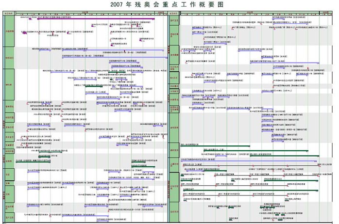 曹蕾:奥组委于2007年7月-12月举办了26项测试赛,在场馆运行团队尚未全部到位的条件下,如何在短期内完成一个涉及近30个业务口,发挥具有统筹全局作用,有效并快速整合资源的综合工作计划,对于各单项赛事组委会是一个具大的挑战。重点工作计划是领导指挥决策的可靠依据,是指导筹办工作的总体规划,是监控总体工作进展的基准计划,是各参与机构的沟通工具与平台。纳入重点工作计划范围的是对赛事举办有决定性影响的任务以及在赛事中重点测试的内容,主要包括竞赛组织、场馆运行、运行保障。运用“驭时多项目整合管理体系”的方法,在短期内完成了26项测试赛重点计划概要图的编制与设计,计划编制方法涵盖了数据收集与汇总、数据组织与设计、信息技术实现等三个部分。测试赛重点工作计划概要图如下:
